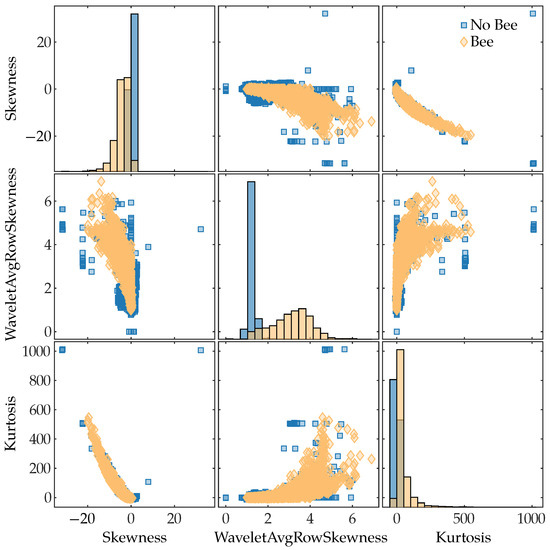 To see which of the extracted features had the most predictive power for discriminating between classes (“Bee” and “No bee”), we computed the mutual information [66] between the features and the class labels. We used the mutual_info_classif function from Python’s scikit-learn library to compute the mutual information scores; this function is based on a k-nearest-neighbor method of computing mutual information between continuous and discrete variables [67]. The results are shown in Figure 9. The top three features were the time-domain skewness, the average skewness of each row in the wavelet scalogram, and the time-domain kurtosis. Figure 11 shows a pairwise scatter plot of these three features; none of the top three features are separable, but there are clear differences between the “bee” and “no bee” distributions in Figure 11. The following paragraphs interpret the discrimination ability of each of the top three features.