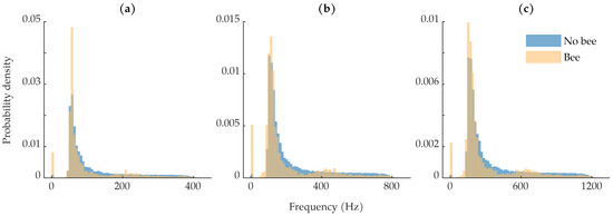 The low mutual information between the harmonic frequency values and the class labels, as seen in Figure 9, is surprising given that the wingbeat-modulation lidar method is based upon being able to determine the insects’ wingbeat spectra. This low mutual information is due to the significant overlap in the “Bee” and “No bee” harmonic frequency distributions, as shown in Figure 12. The distributions in Figure 12 were computed on each row of the training dataset. As seen in Figure 12a, compared to the “No bee” distribution, there is an extra bump in the “Bee” distribution around 200 , corresponding to the expected bee fundamental wingbeat frequency. The tails of the “No bee” distributions are more smooth, with no increase around the expected wingbeat frequencies. The majority of the “No bee” rows should exhibit no harmonic structure; in this case, an ideal frequency estimation algorithm would not report erroneous harmonic structure. Our fundamental frequency estimation algorithm looks for the largest local maximum in the harmonic product spectrum; if any local maxima exist, our algorithm returned an estimated frequency, otherwise the algorithm returned 0. In Figure 1d, the small peak around 100 in the stationary object’s spectrum would be interpreted as a local maxima and would thus be considered that observation’s fundamental frequency. This behavior is problematic for the non-bee observations and contributed to the overlap between the distributions.