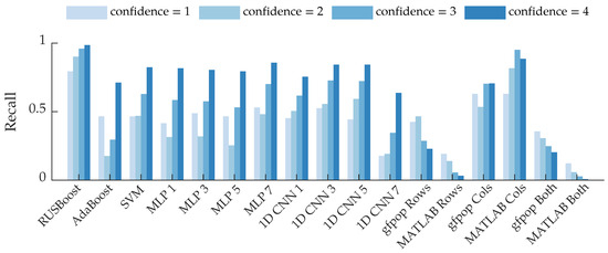All the methods used were analyzed based on their recall, precision, and (MCC) [55] scores. It is well known that accuracy is not an informative metric for imbalanced data [64]; thus, accuracy is not used in this paper. Recall is the percentage of the target class that the method was able to identify and ranges from 0 to 1. Precision is the percentage of true positives relative to the total number of positive identifications and ranges from 0 to 1. MCC is a metric that gives a high score if the method is able to achieve an accurate value in each of the four categories of the confusion matrix. The MCC ranges between −1 and +1. Positive values indicate a positive correlation between the predictions and the true labels, with +1 being perfect prediction. A value of 0 indicates that the prediction is no better than random predictions. Negative values indicate a negative correlation between the predictions and the true labels, with −1 indicating complete disagreement between the predictions and the true labels.