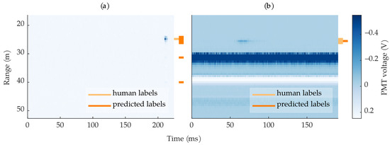 As mentioned in Section 2.2, an impedance mismatch caused reflections in the lidar’s wiring, which resulted in undesirable artifacts in the data. These artifacts can easily confuse the bee detection algorithms, as they share the same characteristics as the bee that produced them. Since the PMT output current is negative, any positive voltage values were due to reflections. Since the samples in each row form a time-series at a particular range bin, any large changes between subsequent samples would be caused by a moving object at that range bin. Using this knowledge, we thresholded all positive voltage values to the corresponding row’s average value. Figure 8 shows an example image before and after thresholding. The thresholding reduced most of the reflections, but not all, because some of the reflections resulted in small negative voltages near 0. Since we cannot easily distinguish between a small negative voltage caused by a reflection and a small negative voltage caused by a weak return from a bee or other object, we settle for leaving some artifacts in the data. While leaving these artifacts will increase the false positive rate of the algorithms, a more aggressive removal would result in missed insect detections.