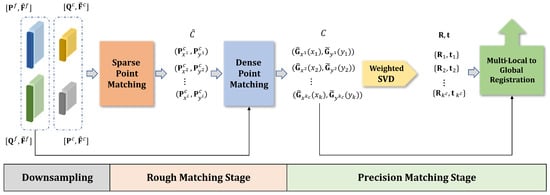 Our approach follows the correspondence-based methodology, typically involving two primary stages []. First, obtain point correspondences. Older methods, such as the ICP algorithm [], identify the closest point pair in the source point cloud and target point cloud as a match. The other one is to determine the correspondence based on the feature descriptors [,,,,], and point pairs with similar features will be matched. This is further divided into hand-crafted descriptors and learning-based descriptors. In recent years, with the boom in deep learning, learned descriptors have shown better results. Subsequently, an algorithm such as SVD is used to compute the transformation matrix between the two point clouds.