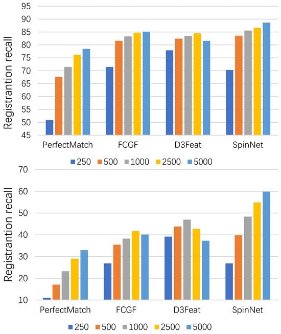 There is a loss of original pose information during the transition from low to high latitudes, which makes the learned feature descriptors not discriminative [], especially when facing scenes with a large number of structural repetitions and local similarities; however, the fuzzy feature descriptor might result in incorrect correspondences. When the number of point correspondences is too small, the difficulty of registration increases dramatically, as shown in Figure 2, while the registration recall of these methods decreases dramatically when the number of point correspondences decreases, which is due to the non-robust correspondences. Some methods encode the location by explicit coordinate embedding, and GeoTransformer [] improves the discriminative nature of the feature descriptor by adding relative position information to the transformer. The limitation of these methods is that they are more sensitive to noise, outliers, density variations, and overlap rates. In scenes with low density and noise, their effectiveness will be significantly diminished, preventing them from achieving the desired results. To address this problem, we advocate the use of learning methods to obtain information about the underlying geometric structure of the point clouds. For this purpose, we designed the local geometric network (LG-Net) module to improve its discriminative ability at the feature level.