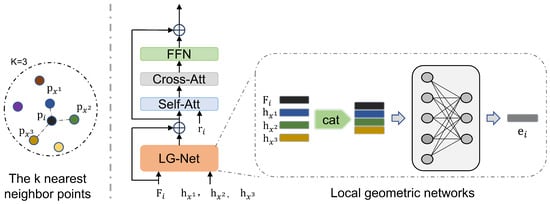 where  denotes the distance from point  to point . Then, the features of the k nearest neighbor sparse points of each sparse point will be used as the input to the local geometric network:
