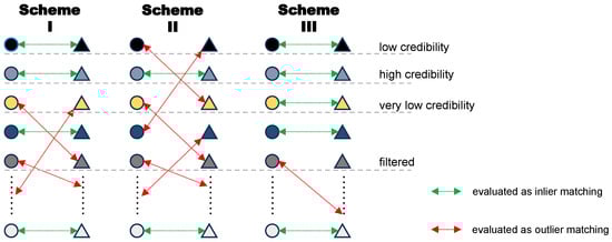 where  is the acceptance radius. We evaluate each hypothetical scheme by counting the number of its inlier matches according to Equation (15), select the  schemes with the most inlier matches, and combine them together. The weights corresponding to the outlier matches in each scheme will be masked and updated to . Finally, we compute the average of the weights: