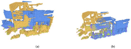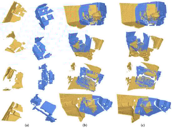There are 62 scenes in the 3DMatch dataset, of which 46 scenes are used for training, 8 for validation, and 8 for testing. In this paper, we use the processed dataset in []. The difference between 3DMatch and 3DLoMatch is that the overlap of the test sample data in 3DMatch is greater than 30%, and the overlap of the 3DLoMatch test sample data is between 10% and 30%. When the overlap rate is low, the registration becomes more difficult. Figure 5 shows the registration results of our method on 3DMatch.