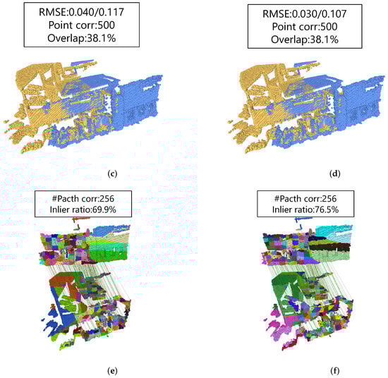 The visualization results of GeoTransformer and MLGR on the 3DMatch dataset. RMSE (m) includes two values, the left one being the error for this sample and the right one being the average error tested on the dataset. Point corr indicates the quantity of point correspondences. Overlap represents the overlap rate between the two point clouds. Patch corr denotes the quantity of patch correspondences, and the colors of different patches vary. Compared with GeoTransformer, the average value of our RMSE is smaller. (a) input; (b) ground truth; (c) GeoTransformer-pose; (d) MLGR-pose; (e) GeoTransformer-patch correspondences; and (f) MLGR-patch correspondences.