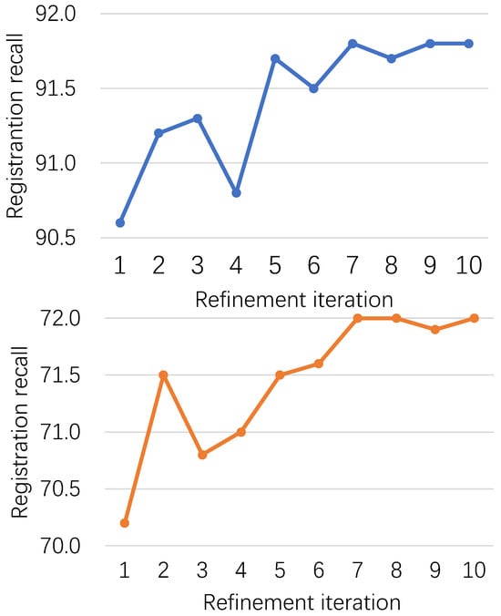 We then evaluated the effect of the number of iterations, , on the results at the refinement step of the multi-local-to-global registration, as shown in Figure 7. We increased  from 1 to 10, and RR increased with the number of iterations, eventually approaching saturation at . In this paper, we chose  for the experiment for better equilibrium accuracy and speed.