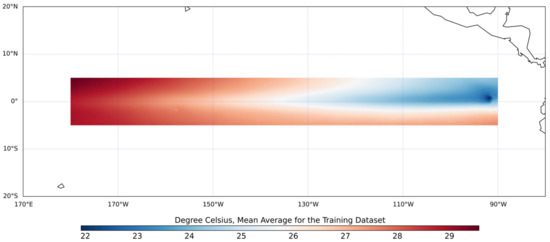 We use the GHRSST Level 4 MUR Global Foundation Sea Surface Temperature Analysis dataset (MUR SST) in our experiments [28]. MUR SST is one of the current highest-resolution SST analysis datasets, providing global daily SST from 31 May 2002 to the present. The spatial resolution of MUR SST is , roughly at 1 km intervals. MUR SST combines three types of satellite SST datasets: HR infrared SST data of about 1 km, medium-resolution AVHRR (infrared) SST data of 4 to 8.8 km, and microwave SST data with a sampling interval of 25 km [29]. In addition to these three satellite-derived data, MUR also assimilates two types of in situ SST measurements to enhance the estimation of the underlying temperature. Due to the computational burden of using the entire dataset, we extracted the SST in the region 180°W–90°W and 5°S–5°N as the study area, as shown in Figure 1. The training dataset used for model development comprises daily samples spanning from 1 June 2002 to 31 December 2016. Each sample consists of 1002 × 9001 cells, resulting in a total of 5398 samples, while the daily data from 1 January 2017 to 31 December 2022 with a total of 2188 samples serve as the validation dataset. For testing, in addition to the MUR SST validation dataset described above, we also report results for the MUR SST Monthly Mean dataset as an external validation. MUR SST Monthly Mean dataset is created by NOAA NMFS SWFSC ERD based on the GHRSST Level 4 MUR SST daily dataset mentioned above. It has the same spatial resolution as daily data. We use the same study area as the one used for the MUR SST dataset. The MUR SST Monthly Mean dataset is comprised of monthly samples spanning from 2003 to 2020.
