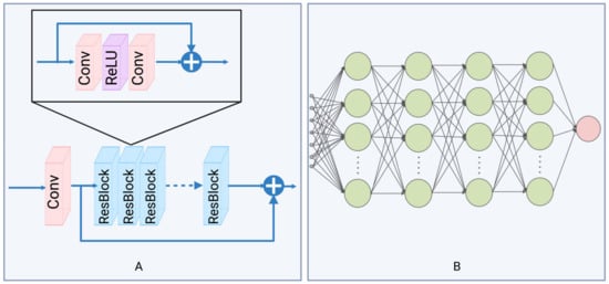 The main architecture of the network used in the proposed method: (A) a partial structure of EDSR, serving as the encoder in the proposed interpolation method; (B) a multi-layered MLP, functioning as the decoder in the proposed interpolation method.