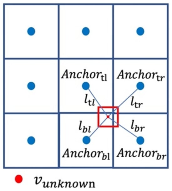 We consider the four points around the unknown grid as anchor points. As seen in Figure 3, they are located at points , , , and , respectively, on the upper left, upper right, lower left, and lower right of the unknown grid cell. first obtains the interpolation results based on each anchor point for the unknown grid through Equation (2). Then, the final prediction value of the unknown grid is obtained by weighing the average of the four results according to the inverse distance.