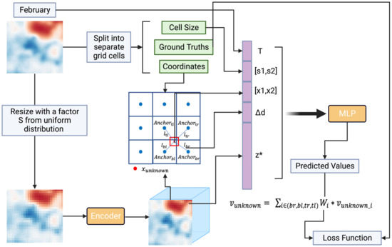 In this section, we discuss the training procedure of . Figure 4 shows how works and its training steps. Our main goal during training is to estimate the parameters of the encoder and the MLP using our training data. For each LR input, the encoder provides an implicit representation for every grid in the LR sample. For every unknown grid in the HR data, our method looks for the four closest known points used as anchors. Using the MLP, we then figure out the value of this unknown grid. After repeating this for every unknown grid in the HR, we get the HR result for the given LR input. As previously discussed, we expect the model to be used to obtain HR data at any enhancement factor after training.