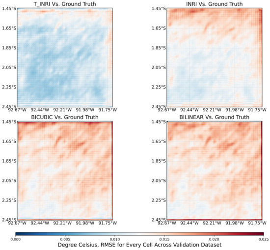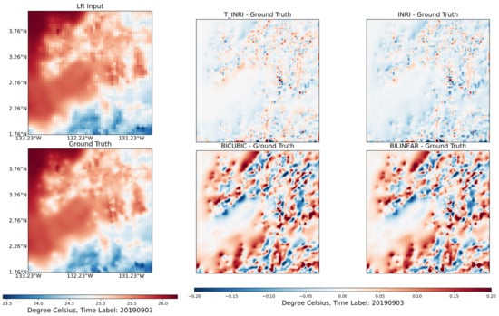 To further validate the robustness and applicability of the proposed method, an additional dataset was utilized. Specifically, the MUR monthly mean SST dataset was employed, which shares an identical spatial resolution with the MUR daily dataset. For evaluation purposes, the original spatial resolution was treated as the ground truth. Corresponding LR inputs were derived using average pooling across different scales. From Table 2, we observe the results based on the additional dataset. The proposed interpolation method, which embeds temporal information, consistently exhibits superior performance across various enhancement scales. When comparing results with and without temporal information, it is evident that for the MUR monthly mean SST dataset, the embedding of temporal information contributes to a more substantial performance improvement compared to the previous validation dataset. For instance, at an enhancement scale of 5, the improvement between with and without temporal information in the additional dataset is 0.008 °C. This gap narrows to 0.004 °C at an enhancement scale of 16. In contrast, for the same enhancement scales, the validation dataset shows a consistent improvement of only 0.002 °C. This indicates that embedding temporal information enhances the generalization capability of the proposed interpolation method.