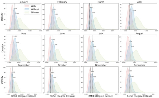 To further investigate the influence of temporal information on the results, we compared the performance with and without temporal information embedded. Figure 7 depicts the error density between HR data generated based on different calendar months and the ground truth observations, with an enhancement scale set to 3. Notably, results incorporating temporal information consistently exhibit smaller errors than those without, and this improvement remains stable across different calendar months. The difference in average monthly error between the two approaches is approximately 0.005 °C. Comparing results across various months, December manifests the smallest average error at 0.009 °C. Meanwhile, August has the lowest standard deviation in error, amounting to 0.003 °C. For results without temporal information, December similarly yields the smallest average error, recorded at 0.013 °C, while July has the lowest error standard deviation, standing at 0.004 °C.