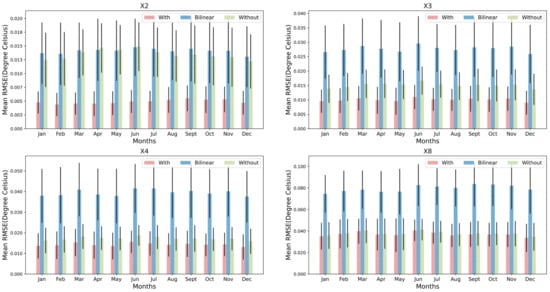 In order to better illustrate the impact of temporal information, we present in Figure 8 the improvement in results obtained with temporal information at different scales and seasons. It is apparent that the figure reflects the same trend observed in Table 1. Specifically, as the enhancement scale increases (here represented as 2, 3, 4, and 8), the difference between results with and without temporal information diminishes. This diminishing trend with respect to the enhancement scale is consistent across each calendar month. For instance, at an enhancement scale of 3, the average difference between results with and without temporal information for every calendar month is approximately 0.005 °C. When the enhancement scale is increased to 8, this average difference narrows to about 0.003 °C. From the analysis of the impact of temporal information, we can conclude that incorporating temporal data can enhance the HR SST results obtained for each calendar month. However, as the enhancement scale increases, the positive influence of temporal information consistently diminishes for every month.