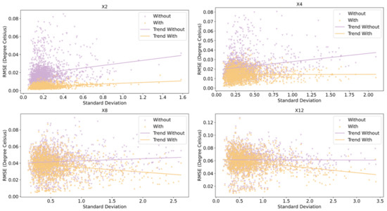 Relationship between RMSE and spatial standard deviation of samples, with and without temporal information, across different enhancement scales.