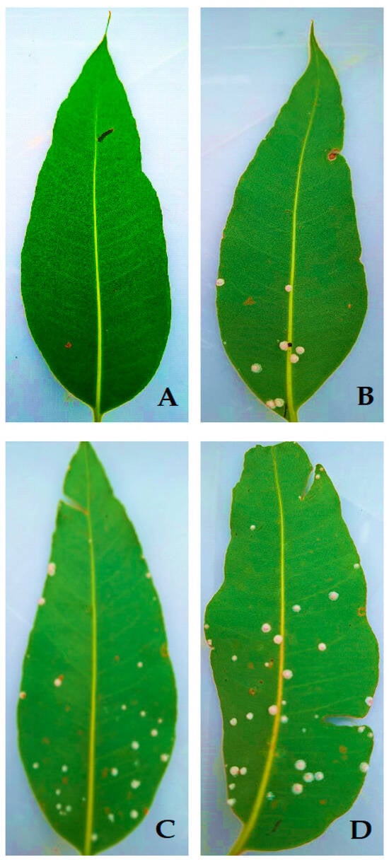 Different levels of red gum lerp psyllid (Glycaspis brimblecombei) infestation on eucalyptus leaves. (A)—control; (B)—N1; (C)—N2; (D)—N3.