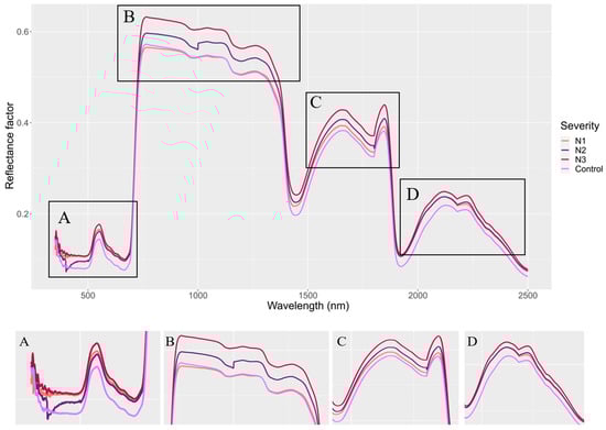 In the 1300–2500 SWIR range, severity level N3 shows greater distinction and higher reflectance than the others. In Figure 2C, there is greater proximity between N1 and the control, while in Figure 2D, the greatest proximity is between the N2 and N1 curves. The control level shows low reflectance throughout the spectral range, while the highest severity level (N3) shows higher reflectance.