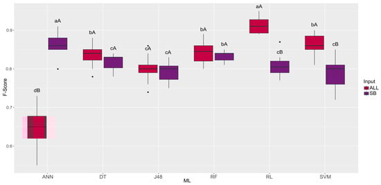 When ALL is used as input, RL shows the best results for the F-score accuracy metric (Figure 4, Table 2). When SB is used, ANN shows better results. Comparing both inputs within each ML technique, ANN shows better accuracy than SB. DT, J48, and RF show no difference in performance between the inputs. RL and SVM show better results when the input used is ALL.
