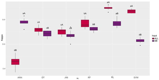 RL and SVM show better accuracy when ALL is used as input (Figure 5, Table 3). ANN and RL show better results when SB is used as an input. When comparing the inputs within each algorithm, all algorithms except ANN perform better when ALL is used.