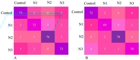 Confusion matrix to classify the severity of the G. brimblecombei attack for algorithms RL (A) and SVM (B) using the ALL inputs.