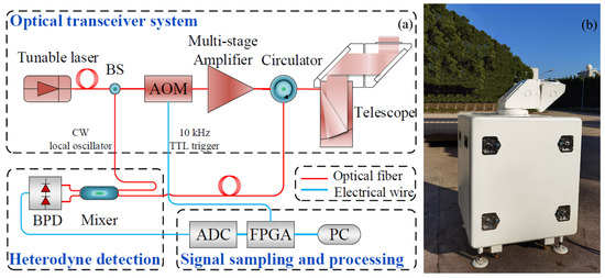 The schematic structure and a photograph of the Windviewer100s lidar system. (a) Schematic diagram of the system, which contains the following three main parts: an optical transceiver system, a heterodyne detection system, and a signal sampling and processing system. BS: beam splitter; CW: continuous-wave laser; AOM: acousto-optic modulator; TTL: transistor–transistor logic; BPD: balanced photodetector; ADC: analog-to-digital converter; FPGA: field-programmable gate array; and PC: personal computer. (b) Photograph of the system in operation. The volume is about 820 mm (Length) × 820 mm (Width) × 1350 mm (Height).