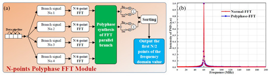 In practical applications, the time domain signal data acquired by the ADC are real, and the FFT of the real data exhibits a conjugate symmetric property in the frequency domain. Only half of the frequency domain information was valid, thus resulting in some redundant computations in the frequency domain transformation. Therefore, in the multi-path FFT algorithm structure, only the magnitude square sum of the first N/2 frequency domain points was computed. Using the VIVADO [36] tool integrated design environment, the calculation results of a 512-point multi-path FFT for simulated data with a signal frequency of 60 MHz and a sampling rate of 400 MS/s are shown in Figure 4b. The calculated peak frequency was 60.16 MHz, and this is consistent with the results of serial FFT calculations, thus verifying the feasibility of this algorithm.