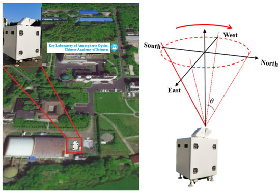 After the system was assembled, measurements were conducted in September 2022 at the Key Laboratory of Atmospheric Optics, Chinese Academy of Sciences (31545N, 117107E), as shown in Figure 5. The Windviewer100s coherent wind lidar developed in this study and the Windcube100s scanning lidar produced by Leosphere, in France, were simultaneously used for measurements. The two lidars were positioned 10 m apart, and the measurements were conducted using a Doppler beam scanning mode with a zenith angle of 15. The main performance parameters of the Windcube100s are shown in Table 2, and it can measure the horizontal wind speed and wind direction in the vertical range of 50 m to 3170 m. The threshold of the CNR for the Windcube100s to reconstruct horizontal wind speed and wind direction was −26.5 dB.