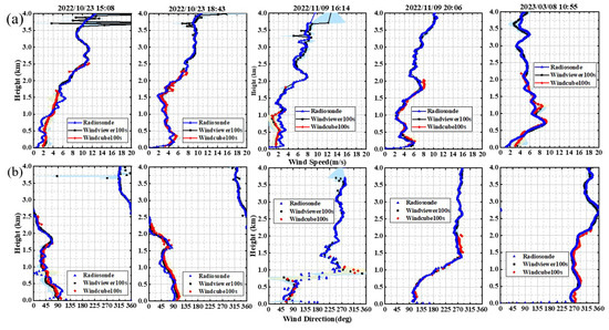 To ensure continuous and normal observations by the coherent wind lidar during radiosonde operations, the release time of the weather balloon was recorded. During the observation and comparison period, five weather balloons were released, and they corresponded to the local times of 15:08 on 23 October 2022, 18:43 on 23 October 2022, 16:14 on 9 November 2022, 20:06 on 9 November 2022, and 10:55 on 8 March 2022. Figure 9 presents the results of the observation data comparison.