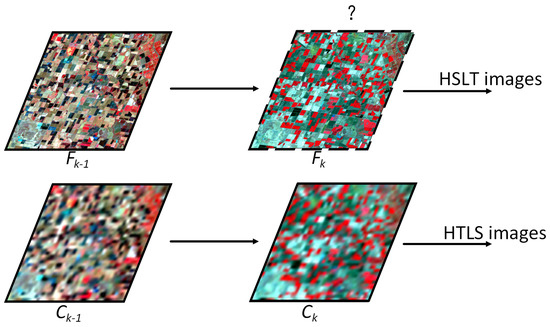 where represents the difference between two HSLT images at and k. However, cannot be solved directly. In fact, the change information is concentrated in that of the HTLS images. Thus, Equation (1) can be written as follows: