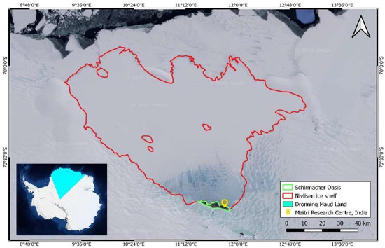 Antarctica, renowned for its vast ice sheets, encompasses approximately 98% of the landmass in the Antarctic region. Within East Antarctica, a significant territory known as Dronning Maud Land sprawls across more than 2.7 × 106 km2. Research findings revealed that Dronning Maud Land experiences an annual mean temperature as low as −40.9 °C, accompanied by an annual mean wind speed of 4.31 m/s [40]. Also, analyzing the atmospheric dynamics during extreme precipitation events identified unusual variations in meteorological parameters, including temperature and wind patterns [41]. This expansive region boasts a coastline stretching approximately 2000 km, characterized by immense ice shelves. The degree of surface ice loss serves as a critical determinant in assessing the extent of melting on these ice shelves [7,15,30,35,42,43]. The selection of Nivlisen Ice Shelf (NIS) for this study stems from the recent surge in melt ponds and supraglacial lakes (SGLs) observed within the ice shelf region. Moreover, NIS experiences significant melting throughout the austral summer (November, December, January, and February), resulting in the formation of SGLs. These phenomena render the ice shelf increasingly susceptible to hydrofracturing [13,14,18,44,45,46,47], making it a pivotal area for investigating the processes and causes leading to ice loss on the Antarctic ice shelf [48]. Figure 1 illustrates the expansive nature of NIS, covering an area of approximately 7600 km2 and extending around 80 km north to south and 130 km east to west into the Lazarev Sea [2]. Situated within the center of Dronning Maud Land (cDML) at coordinates 70.3 S and 11.3 E, NIS possesses ice thickness ranging from 150 to 700 m. The Vigrid and Lazarev ice shelves flank NIS, while the Potsdam Glacier feeds it from the southeast, contributing an average ice thickness of 1000 m. In the southeastern corner of the ice shelf, the exposed ice moves at an average speed of 80 m per year due to katabatic winds [49]. The southern part of NIS encompasses the Schirmacheroasen, an ice-free region with lakes, ponds, and a maximum elevation of 250 m above sea level [50]. During the austral summer months (November to February), surface melting occurs, resulting in the creation of melt ponds and SGLs across various regions of NIS, including its north, west, and southern sectors. Since 2016, there has been a notable evolution in meltwater ponding attributed to rising temperatures. As a consequence, NIS is experiencing accelerated melting, making it a strategically significant location for investigating the dynamics and factors influencing ice loss on the Antarctic ice shelf [51].