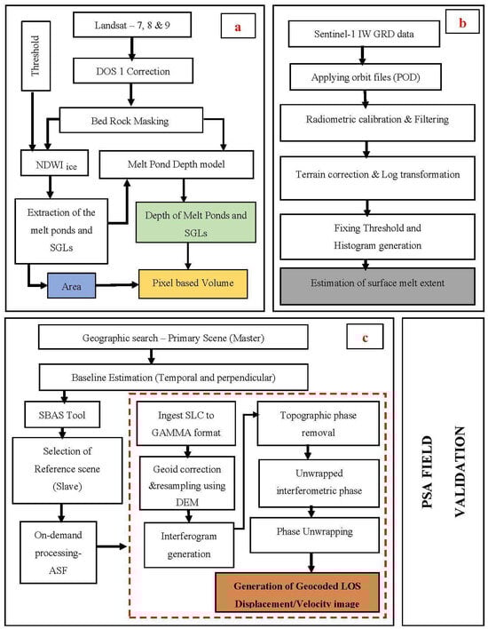 Process flow: estimation of surface melt extent (a), depth of melt ponds and supraglacial lakes using melt pond depth model, area and volume (b), and ice flow velocity using (c).