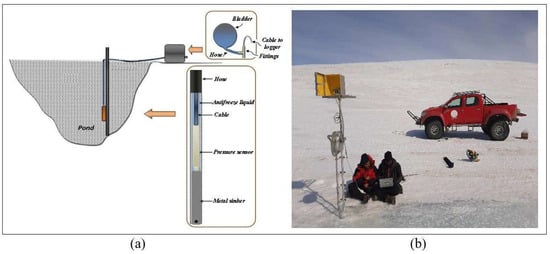 (a) Schematic representation of the pressure sensor assembly installation over the melt pond situated near Maitri station. (b) The bladder box on the T-junction is fitted at the top end of the hose to allow the logger cable to exit the closed PSA system and the other T-junction’s branch connects to a 2 L rubber expansion bladder.