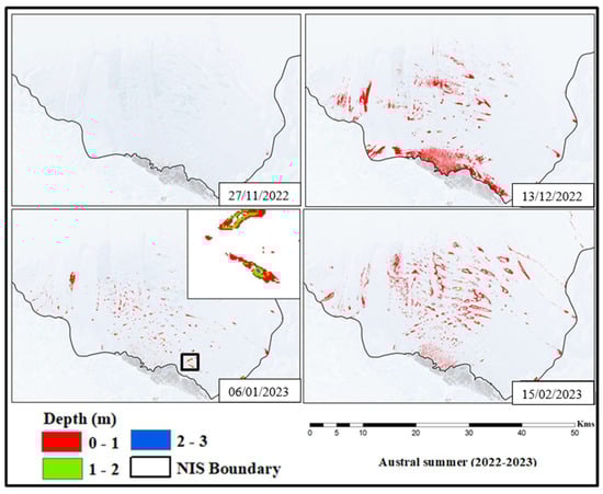 The surface melt extent (SME) over NIS for the austral summers 2019–2020, 2020–2021, 2021–2022, and 2022–2023.
