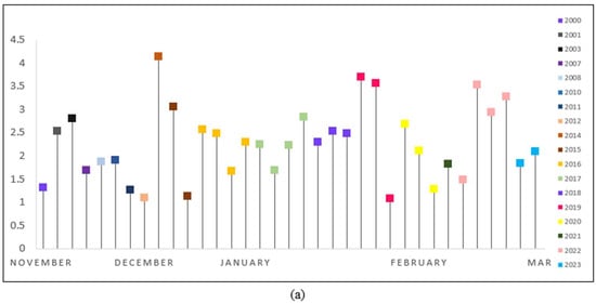 From the temporal pattern analysis, it can be seen that each austral summer witnesses a notable surge in surface melting during November. The extent varies, but this month consistently experiences high surface melting. December shows mixed patterns, with fluctuations in surface melt extent. Factors such as freezing winds, wind chill variations, and precipitation contribute to the observed variability. January tends to be the peak melt season, marked by an expanded surface melt area. This consistent trend suggests that, regardless of variations, January consistently exhibits increased surface melting. February experiences fluctuations in surface melt extent. Notable increases, potentially influenced by higher temperatures, decreased precipitation, and the albedo effect [40,41], are observed, but this month also displays variability across the studied years. The austral summer of 2022–2023 contributed to the peak surface melting extent area. November 2022 records a substantial increase in surface melting, covering an average area of 3187 km2, a marked rise compared to previous Novembers. Additionally, February 2023 shows an increase in surface melt, reaching an average area of 3725 km2, similar to patterns observed in February 2020 and potentially influenced by the albedo effect [40,41]. The spatial distribution remains consistent, emphasizing the dynamic nature of surface melt extent influenced by multiple factors.