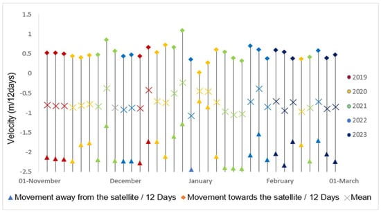 Seasonal surface ice flow velocity measurements collected during the austral summers of 2019–2023 are shown in Figure 8. Figure 9 displays the unwrapped phase and velocity map for 10 January and 22 January 2023 as an illustrative example. Over the course of the austral summers from 2019 to 2023, the ice velocity data reveal significant events that shaped the dynamics of the ice movement. The overall trend in ice velocity across the austral summers of 2019–2023 indicates dynamic and subtle patterns. Across all years, there is a consistent surge in ice velocity during mid-November, with values ranging from 2.13 to 2.23 m/12 days. This surge sets the initial pace for the ice dynamics during the austral summer. December exhibits varied patterns, with some years showing a decline in velocity, such as in 2019 and 2021, while others display temporary recoveries or fluctuations. This suggests a degree of instability and responsiveness to environmental conditions. January consistently emerges as the month with the highest ice velocities, reaching values like 2.11 to 2.41 m/12 days. This peak aligns with the peak melt season, indicating a potential correlation between increased velocity and melting dynamics. February displays fluctuations in velocity, with some years showing decreases from January levels, while others exhibit variations. The patterns in February underscore the complex relationship between ice dynamics and the later stages of the austral summer. There is a notable decline in velocity observed in the austral summer of 2021–2022, where both mean and maximum velocities show a decreasing trend. This decline suggests potential shifts in environmental conditions or ice shelf stability. Throughout the years, there is consistent variability in velocity values, emphasizing the dynamic nature of ice movement. The fluctuations and shifts in velocity indicate the responsiveness of the ice shelf to external factors. The analysis highlights a connection between surface melt and ice velocity. Higher maximum and mean velocity values consistently occur in January, coinciding with significant surface melting. December, with its fluctuations, suggests a period of instability and the onset of melting. The recurring observation of peak velocities in January across all years suggests the significance of this month in terms of ice dynamics and melting processes.
