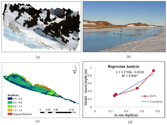 (a) An aerial view of the selected melt pond, the RGB image of the lake obtained from P4 multispectral sensor. (b) The view of the lake during the peak melting period, on 20 December 2022. (c) The model-based melt pond depth derived from the UAV survey on 20 December 2022. (d) Correlation analysis of the measured values.