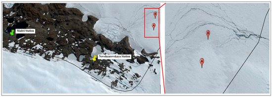 Similarly, field validation of the ice flow was conducted using SP80 Spectra Precision GNSS receivers with two ground control points (GCPs) established near the grounding line of the NIS from 29 December 2022 to 10 January 2023, with a 12-day interval (Figure 13). This data collection timeframe was synchronized with the Sentinel-1 satellite data acquisition. The obtained velocity values from both the GNSS and DInSAR processes for the NIS are presented in Supplementary Figure S21. It is important to note that uncertainties exist, and discrepancies in the measured velocity are observed due to the different nature of the measurements. The GNSS-based velocity provides a 3D measurement, while the DInSAR-based measurement is in the line-of-sight (LOS) direction. These differences, along with uncertainties, contribute to the observed variations in the measured velocity.