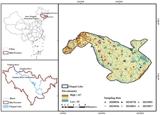 Chagan Lake is the seventh-largest freshwater lake in China and the largest natural lake in Jilin Province, with a surface area of 420 km2 and a mean water depth of 2.5 m [31,32]. The main input source of Chagan Lake is the Songhua River, and the lake is one of the eutrophication lakes in China [33]. Chagan Lake is endowed with rich natural resources and is a well-known fishery and reed industry base. Although the main economic value of the lake lies in its fish resources, it is also important for agricultural and recreational use.