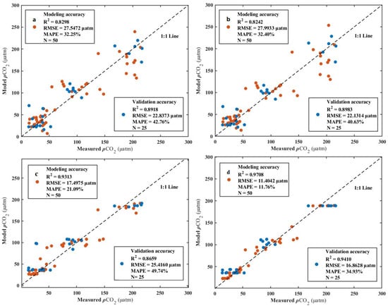 Calibration and validation of pCO2 model for Chagan Lake based on band surface reflectance. (a) Band difference regression model; (b) exponential regression model; (c) random forest model; (d) XGBoost model.
