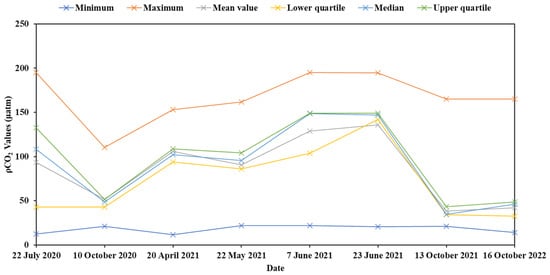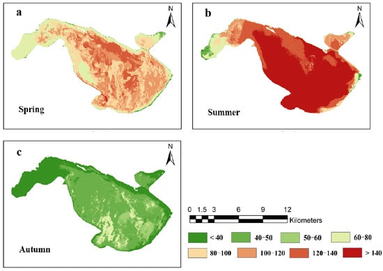 A seasonal analysis of the model results was conducted (Figure 3, spring: March–May; summer: June–August, autumn: September–November). The highest seasonal mean pCO2 values in Chagan Lake were in the summer (mean = 132.45 ± 24.44 μatm), followed by spring (mean = 98.11 ± 18.24 μatm), and the lowest was in autumn (mean = 44.03 ± 8.46 μatm). The characteristic values were analyzed (Figure 5 and Figure 6) and it was revealed that the lowest pCO2 was found in autumn, followed by spring, and highest value was found in summer. The trends of the eigenvalues were essentially consistent (Figure 6a). The mean, lower quartile, median, and upper quartile changes were the highest in summer (120–150 μatm), followed by spring (80–110 μatm) and autumn (30–50 μatm) (Figure 6b). It was observed that the autumn pCO2 values were the lowest; the spring pCO2 values were about twice those of autumn; and the summer pCO2 values were thrice those of autumn and about 1.5 times those of spring. Then, the XGBoost model was used to invert the images and the ENVI Quick Stats function was adopted to obtain the eigenvalues of the inversion results, including the maximum and minimum values; mean; and the lower, median, and upper quartiles, as shown in the Figure 5.