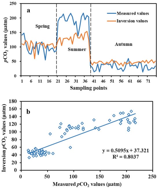 Quarterly comparison and precision of measured pCO2 and inversion values at sampling points. (a) Quarterly comparison of measured pCO2 and inversion values at sampling points; (b) Precision of measured pCO2 and inversion values at sampling points.