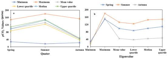 Quarterly series variation analysis of pCO2 eigenvalues. (a) The variation of pCO2 eigenvalues with quarter; (b) Comparison of the variation trend of pCO2 eigenvalues in each quater.