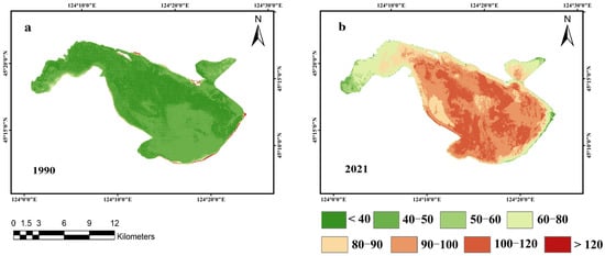 The pCO2 values in Chagan Lake in 2021 were high in the southeast region and low in the northwest region (Figure 7b). According to the 2020–2021 phytoplankton sampling analysis of Chang et al. [32], the phytoplankton biomass in the southeast of Chagan Lake was essentially smaller than that in the northwest. It comprised mainly chlamydomonas and chlamydomonas ovate, the biomass in summer was lower than in autumn, and photosynthesis absorbed less CO2. This produced a spatial distribution with high pCO2 values in the southeast region and low pCO2 values in the northwest region. Compared to the spatial changes between 1990 and 2021 (Figure 7), the spatial distribution was consistent, but the pCO2 values in 2021 were higher than those in 1990, and the high-value area in southeast China in 2021 was significantly larger than that in 1990, which could be due to the increase in eutrophication in Chagan Lake.