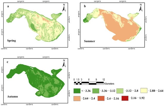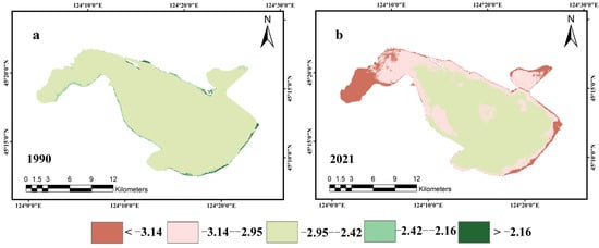 CO2 flux through the water–atmosphere interface of Chagan Lake was calculated based on the modeled pCO2 values. This negative value of CO2 flux values indicates that Chagan Lake was absorbing CO2 from atmosphere (i.e., the lake functioned as a weak carbon sink). The CO2 flux was lowest in summer, ranging between 2.4 and 2.64 mmol/m2/d, followed by spring (2.64–3.12 mmol/m2/d), and it was highest in autumn, with values above 3.36 mmol/m2/d (Figure 8). The study also compared these CO2 fluxes to those in 1990 (Figure 9), which showed that Chagan Lake was a carbon sink in 1990 and 2021 and the CO2 flux increased between 1990 (mean = −2.53 ± 0.07 mmol/m2/d) and 2021 (mean = −2.96 ± 0.13 mmol/m2/d).