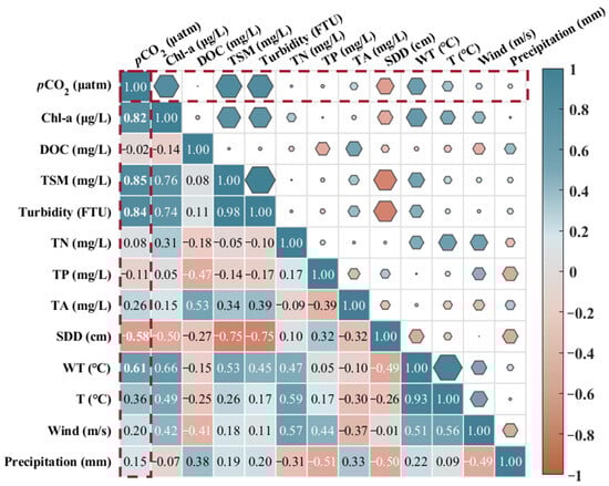In addition, in Chagan Lake, the correlations between total suspended matter concentration and turbidity and pCO2 were high (Figure 10). High turbidity increases the respiration rate of aquatic animals and plants and promotes CO2 production and release [58]. SDD is negatively correlated with pCO2, and with decreasing SDD, CO2 emissions fall and the degree of eutrophication increases.