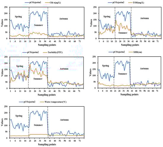 In addition, several influencing factors (chlorophyll a, total suspended solids, turbidity, Secchi disk depth, water temperature) that showed a high correlation with pCO2 were analyzed for their changing trends; these factors mainly presented seasonal fluctuations (Figure 12). Among them, the fluctuations in TSM and turbidity were closest to those of pCO2, with more intense fluctuations, while the changes in chlorophyll and water temperature are relatively gentle, with the values all showing summer > spring > autumn. That is, the values of TSM, turbidity, chlorophyll a, and water temperature are higher in summer, and pCO2 values are also higher, with the lowest values occurring in autumn. The trend of changes in transparency, with autumn > spring > summer, is opposite to pCO2 changes: the lowest transparency is found in summer, while pCO2 is the highest.