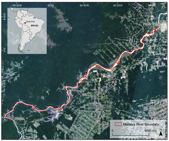 Location map of this study area between Porto Velho and Abuna and the Madeira River boundary used in the analysis. Landsat-8 image courtesy of the U.S. Geological Survey.
