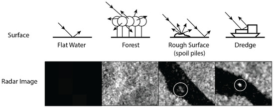SAR wavelengths have unique interactions with terrain and ground features, resulting in measurable differences in backscatter strength that can be useful for identifying areas or objects of interest (Figure 4). Flat surfaces, such as calm water, typically produce low backscatter (specular reflection), and man-made objects with prominent corners, such as buildings or boats, produce a high backscatter signal (corner or double-bounce reflections) [50]. The material that SAR wavelengths interact with also affects the signal return. SAR signals are strongly reflected by materials that conduct electricity well or have a high dielectric constant, like metal [29]. Other materials, such as wood or plastic, are less conductive and create a weaker backscatter return. The interaction between SAR and corner reflectors, particularly against a flat or texturally smooth surface, is valuable for identifying man-made objects such as large metal ships in a calm ocean. ASM dredges are often made of wood but have structured corners, metal sluices, roofs, or other equipment onboard to contribute to the creation of a strong backscatter against a calm river surface.