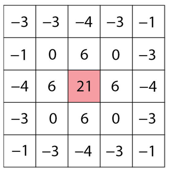 Diagram of the filter weights used in the high-pass sharpening 5 × 5 filter used to emphasize the boundaries between dredge detection pixels and water pixels. The cell under test is represented in red and is the pixel assigned the focal sum calculated by multiplying the weights by each corresponding pixel value and then summing the total for the 5 × 5 window.