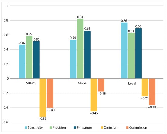 By classifying each detection as either TP, FP, or FN in all datasets produced by the three methods under test, accuracy metrics were calculated. The SUMO Method has the lowest precision and the lowest sensitivity out of all the methods under test (Figure 10). The Global Method has the highest precision but the second highest sensitivity. The Local Method has the highest sensitivity and the second highest precision; it is also the only method that has a higher sensitivity than precision and has the highest count of TPs and the lowest FN. However, the Local Method also has the highest count of FPs. The Global Method has the lowest count of FPs but has a higher count of FN than the Local Method. The Local Method has the lowest omission error, and the Global Method has the lowest commission error. The SUMO Method has the highest rate of both error types. The Local Method is the only one with a higher rate of commission error than omission. The Local Method has the highest F-measure of all methods.